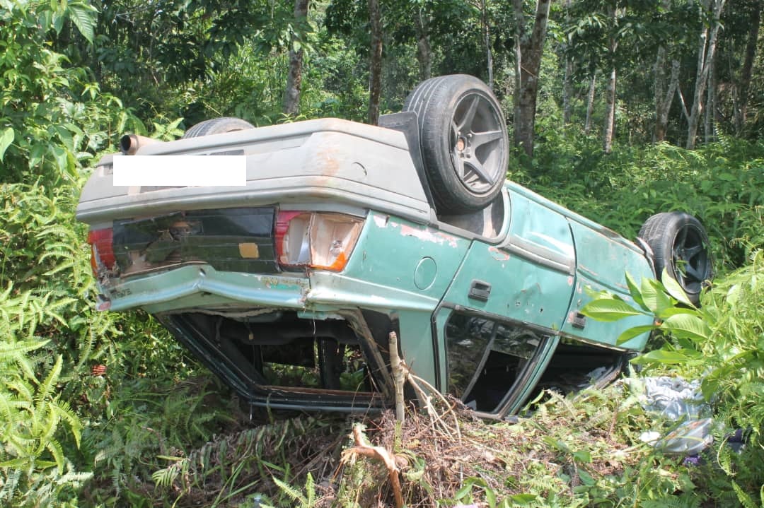 (Keadaan kereta mangsa yang terbalik di Pekan, Pahang/Polis Pekan)