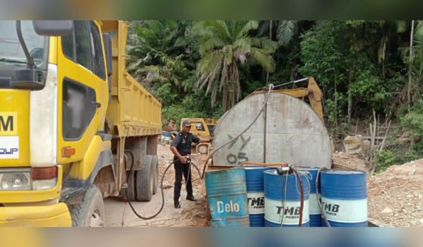 Hasil serbuan menemukan 5,200 liter cecair disyaki minyak diesel yang disimpan dalam sebuah stor haram di kawasan penyelenggaraan dan pembinaan jalan Batu 20, Trong.
