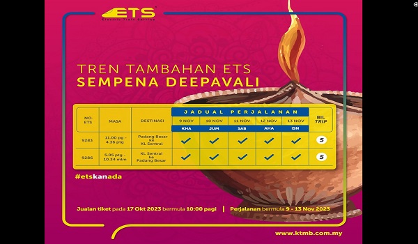 KUALA LUMPUR, 16 Oktober- Keretapi Tanah Melayu Berhad (KTMB) akan menyediakan perkhidmatan tambahan dua unit tren elektrik (ETS) bagi laluan stesen Kuala Lumpur Sentral (KL Sentral) ke Padang Besar dan sebaliknya sempena sambutan perayaan Deepavali.