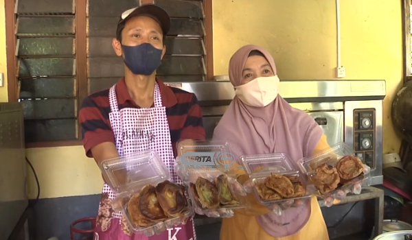 (Ahmad Shauki Othman bersama ibu mertuanya menunjukkan pelbagai jenis kuih akok yang dijual)