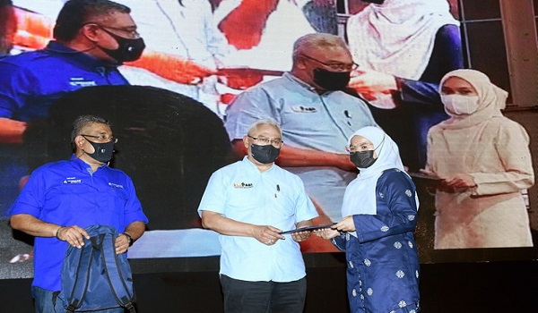 (Tan Sri Noh Omar (tengah) menyampaikan sumbangan kepada pelajar cemerlang pada Majlis Perasmian Penutupan Karnival Pendidikan Yayasan Bank Rakyat Tanjong Karang)
