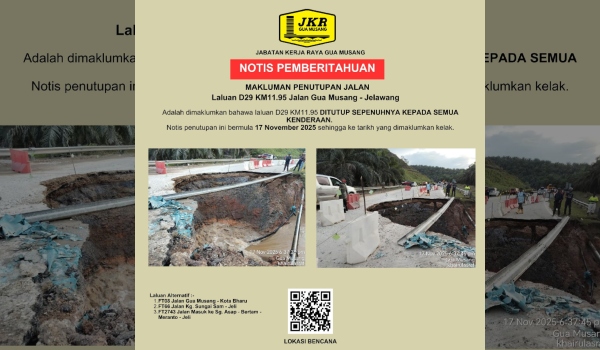 Jabatan Kerja Raya (JKR) Gua Musang menerusi hantaran Facebook memaklumkan, penutupan laluan tersebut berkuat kuasa pada 17 November sehingga tarikh yang akan dimaklumkan kelak.