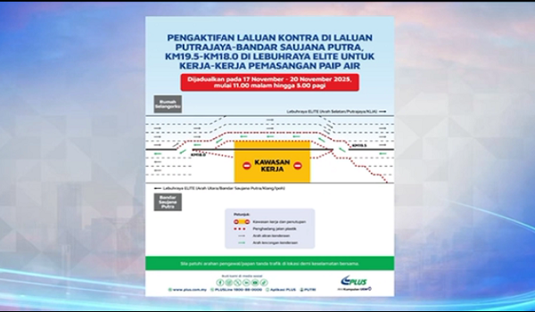 Kenyataan PLUS memaklumkan pengaktifan laluan kontra antara Putrajaya dengan Bandar Saujana Putra dari kilometer (KM) 19.5 hingga KM18 bertujuan melaksanakan kerja-kerja pemasangan paip air oleh kontraktor pihak ketiga.