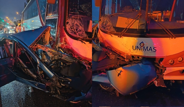 KUCHING, 18 November – Seorang lelaki berdepan detik cemas apabila kereta dipandunya terlibat dalam kemalangan dengan sebuah bas di Jalan Tabuan Jaya, awal pagi tadi (Selasa).