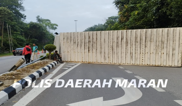 KUANTAN, 28 Disember – Laluan di Kilometer 74, Jalan Kuantan-Kuala Lumpur, berhadapan sebuah sekolah di Maran terhalang akibat kemalangan sebuah lori kontena milik syarikat kurier dan logistik, kira-kira pukul 6.45 pagi tadi.