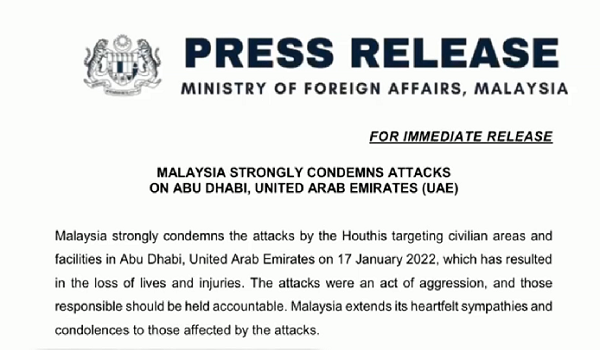 KUALA LUMPUR, 19 Januari – Malaysia mengutuk sekeras-kerasnya serangan Houthi dari Yaman yang menyasarkan kawasan serta kemudahan awam di Abu Dhabi, Emiriah Arab Bersatu (UAE), sehingga mengakibatkan kematian dan kecederaan.