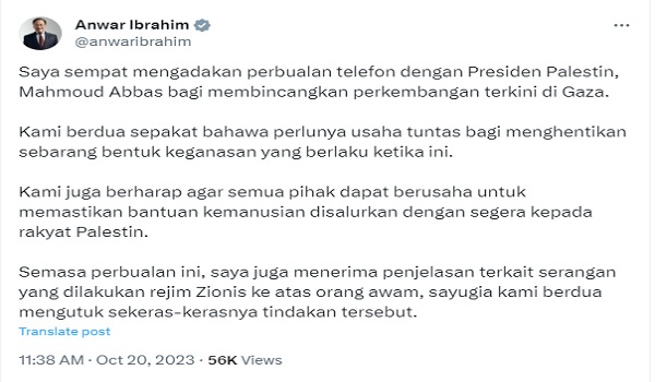 Perdana Menteri Datuk Seri Anwar Ibrahim menerusi hantaran di akaun X beliau berkata, kesepakatan itu disuarakan semasa perbualan telefon antara beliau dengan Presiden Palestin Mahmoud Abbas bagi membincangkan perkembangan terkini di Gaza.
