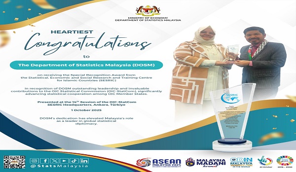 Jabatan Perangkaan Malaysia (DOSM) memaklumkan, pengiktirafan itu disampaikan pada sesi Suruhanjaya Statistik Pertubuhan Kerjasama Islam (OIC-StatCom) ke-14 yang berlangsung di Ankara, Turkiye, dari 1 hingga 3 Oktober.