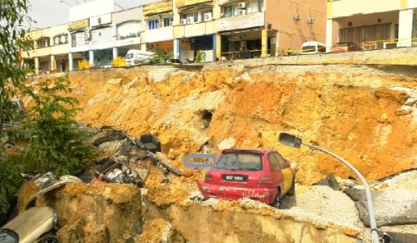 Kejadian difahamkan terjadi ketika hujan lebat menyebabkan longkang pecah dan berlaku mendapan tanah.