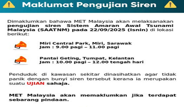 MetMalaysia turut menasihati orang ramai, khususnya penduduk di kawasan sekitar, supaya tidak panik dengan bunyi siren berkenaan kerana ia hanyalah ujian.