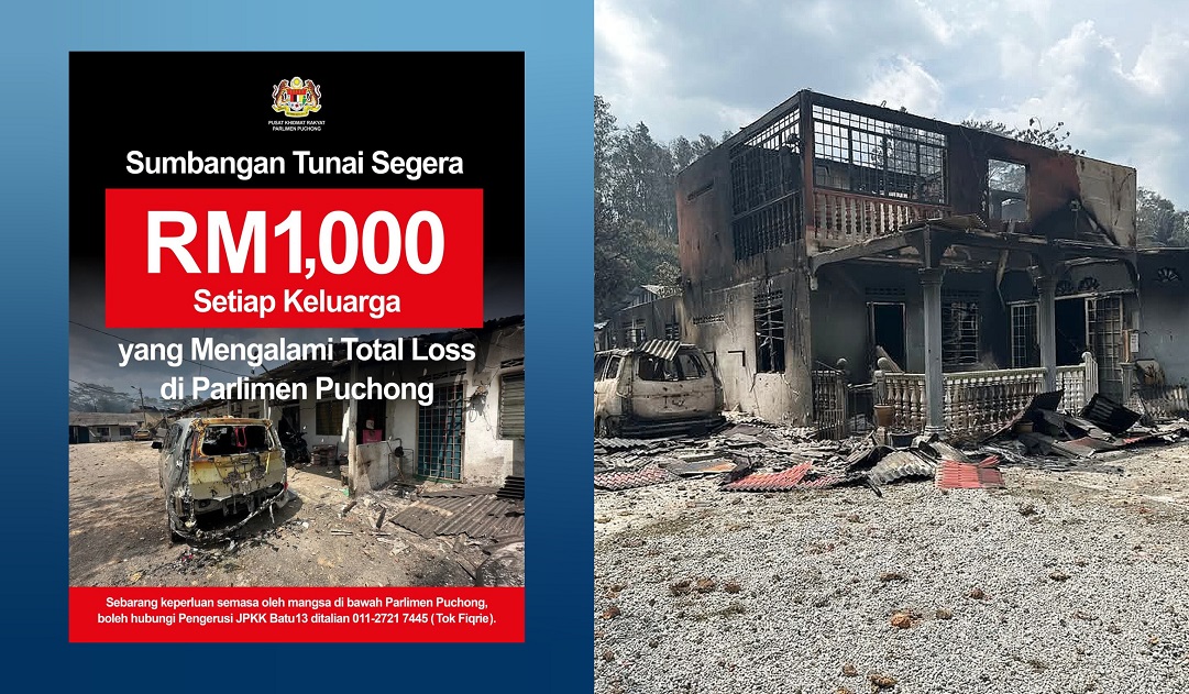 PUCHONG, 2 April- Bantuan tunai sebanyak RM1,000 akan disalurkan kepada setiap ketua isi rumah di Parlimen Puchong yang kediamannya musnah sepenuhnya akibat kebakaran saluran paip gas di Putra Heights.
