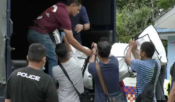 (Anggota polis mengangkat kedua-dua mayat yang ditemui)
