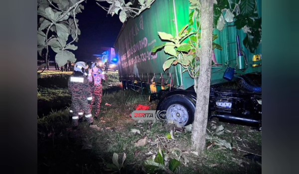 Lori mangsa didapati hilang kawalan lalu terbabas ke bahu jalan sebelum melanggar sebatang pokok.