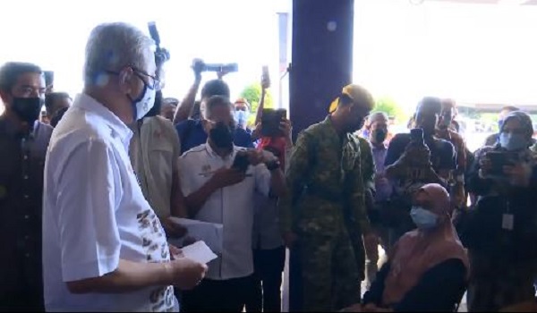 (Perdana Menteri, Datuk Seri Ismail Sabri Yaakob semasa menyampaikan Bantuan Wang Ihsan dan barang keperluan untuk mangsa banjir di Pusat Pemindahan Sementara (PPS) Kampung Batu 23, Hulu Terengganu, semalam)