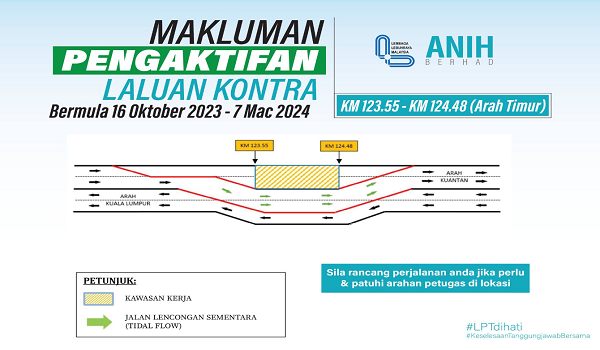 Anih Berhad dalam satu kenyataan memaklumkan, penutupan jalan di laluan arah timur iaitu menghala ke Kuantan akan dilaksanakan bagi melancarkan kerja-kerja pembinaan di kawasan tersebut.