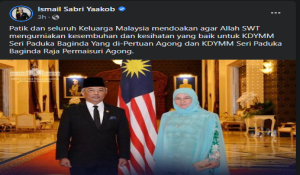 Menerusi hantaran di Facebooknya, Datuk Seri Ismail Sabri berkata, seluruh Keluarga Malaysia turut menitipkan doa yang sama buat Baginda berdua.