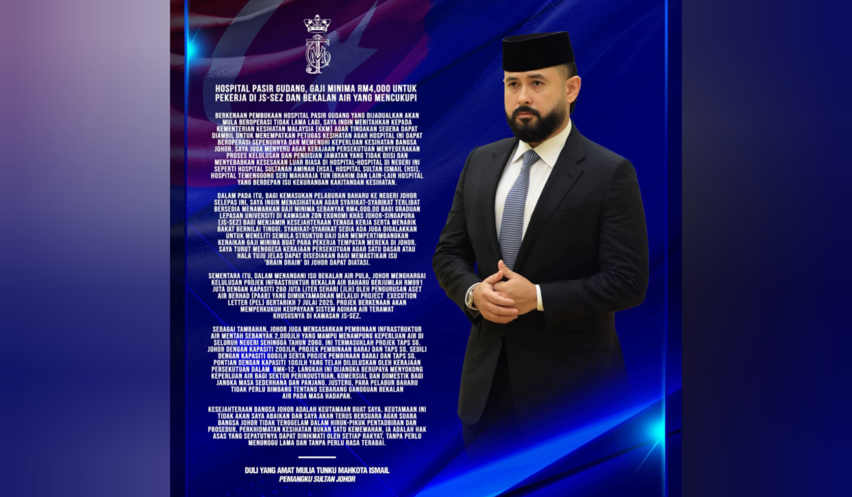 “Saya juga menyeru agar Kerajaan Persekutuan menyegerakan proses kelulusan dan pengisian jawatan yang tidak diisi dan menyebabkan kesesakan luar biasa di hospital-hospital di negeri ini,” menurut kenyataan Baginda yang dimuat naik di laman Facebook HRH Crown Prince of Johor.