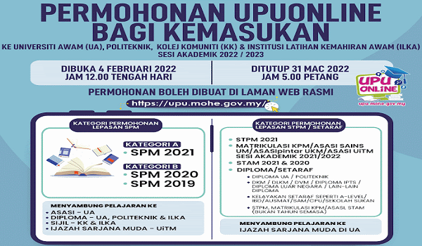 Menurut Menteri Pengajian Tinggi, Datuk Seri Dr Noraini Ahmad, permohonan boleh dibuat terus di laman web upu.mohe.gov.my.