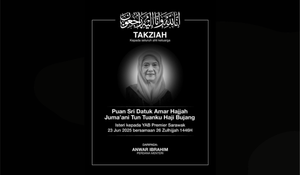 KUALA LUMPUR, 23 Jun – Perdana Menteri, Datuk Seri Anwar Ibrahim menzahirkan rasa dukacita atas pemergian isteri kepada Premier Sarawak, Puan Sri Datuk Amar Hajjah Juma’ani Tun Tuanku Haji Bujang yang menghembuskan nafas terakhir awal pagi tadi.