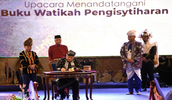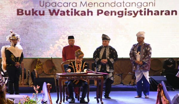 Datuk Amar Awang Tengah Ali Hasan menandatangani Buku Watikah Pengisytiharan pada