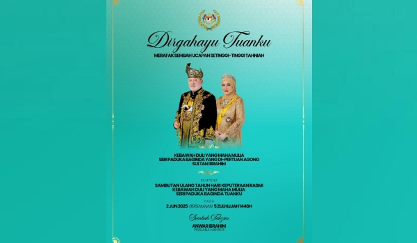 KUALA LUMPUR, 2 Jun- Perdana Menteri, Datuk Seri Anwar Ibrahim merafak sembah ucapan tahniah kepada Yang di-Pertuan Agong, Sultan Ibrahim sempena Sambutan Ulang Tahun Hari Keputeraan Rasmi Baginda hari ini.