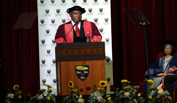 KUALA LUMPUR, 26 Oktober – Presiden Afrika Selatan, Matamela Cyril Ramaphosa menerima Ijazah Kehormat Doktor Hubungan Antarabangsa daripada Universiti Malaya (UM) dalam Istiadat Konvokesyen Khas yang disempurnakan oleh Tuanku Canselor, Duli Yang Maha Mulia (DYMM) Sultan Nazrin Muizzuddin Shah, di sini hari ini.