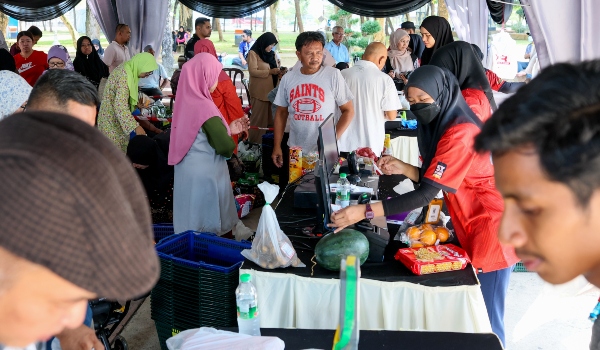 Penduduk mula membanjiri tapak jualan seawal 7.30 pagi bagi mendapatkan barangan keperluan asas dengan potongan harga sehingga 30 peratus berbanding harga pasaran.