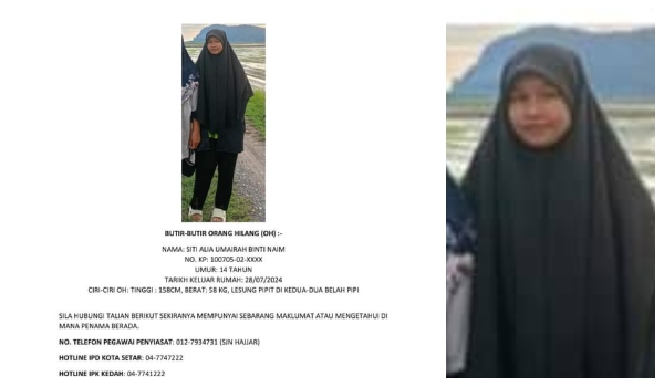 Ketua Polis Daerah Kota Setar, Asisten komisioner, Siti Nor Salawati Saad berkata, remaja berkenaan dikenali sebagai Siti Alia Umairah Naim berketinggian 158 sentimeter keluar dari rumah keluarganya semalam dan tidak pulang sehingga kini.