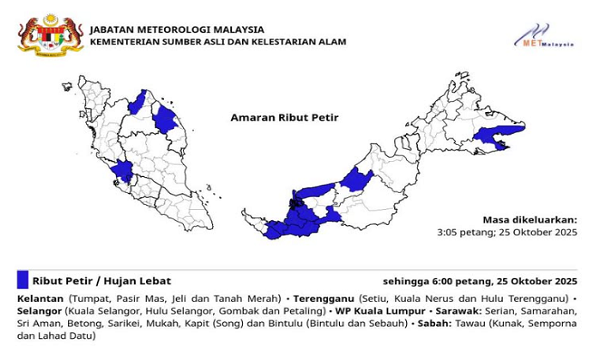 KUALA LUMPUR, 25 Oktober -Ribut petir, hujan lebat dan angin kencang diramal melanda beberapa kawasan di Kelantan, Terengganu, Selangor, Kuala Lumpur, Sarawak dan Sabah hingga 6.00 petang ini.