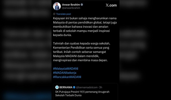 “Tahniah dan syabas kepada warga sekolah, Kementerian Pendidikan (KPM) serta semua pihak terlibat. Inilah contoh sebenar semangat Malaysia MADANI dalam mendidik, menginspirasi dan membina masa depan,” katanya menerusi hantaran di laman sosial X.