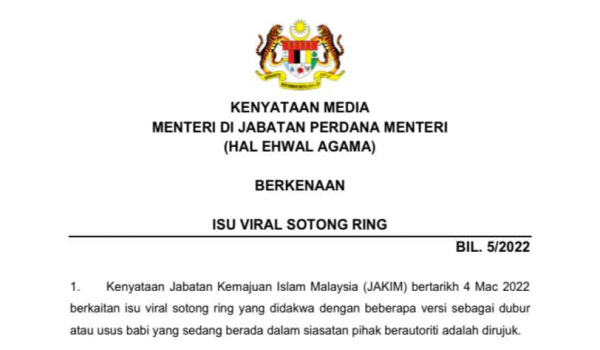 (Kenyataan media dikeluarkan JPM (Hal Ehwal Agama berhubung isu tular ‘Sotong Ring’/FBJAKIM)