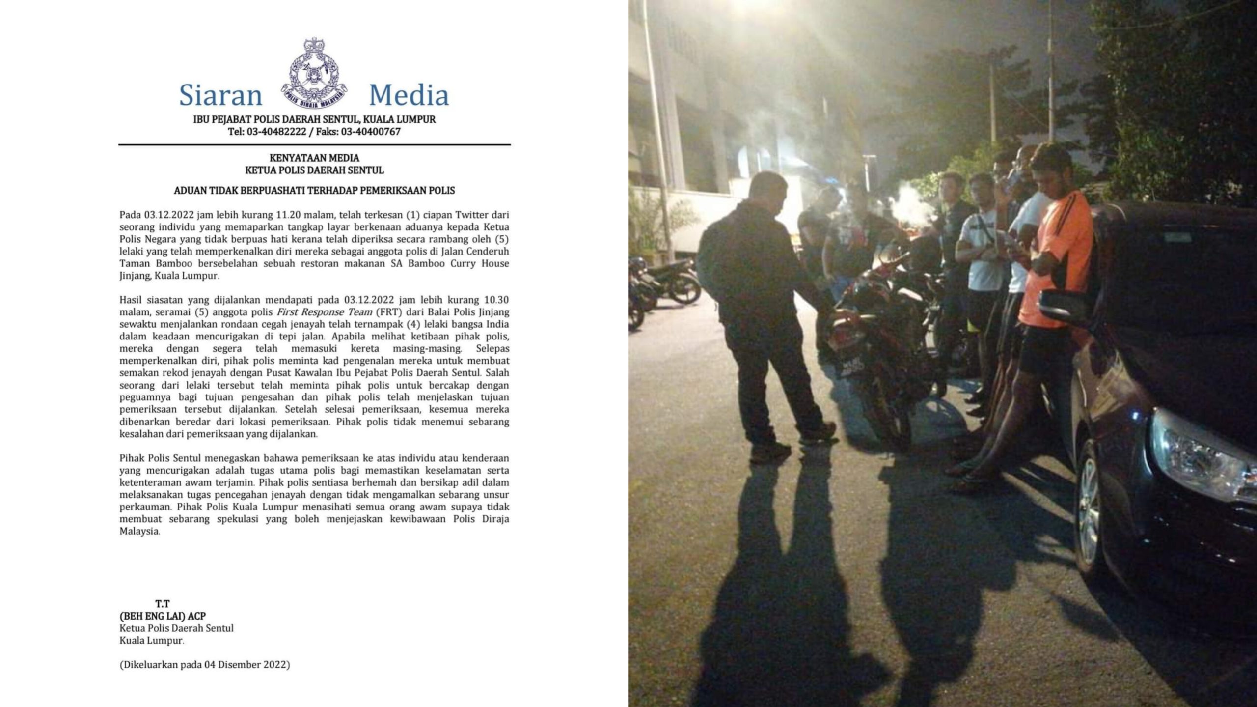 Ketua Polis Daerah Sentul, Asisten Komisioner Beh Eng Lai berkata, pemeriksaan itu adalah tugas yang perlu dijalankan sekiranya pihak polis mengesan sebarang kenderaan atau individu dalam keadaan mencurigakan.