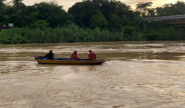 “Sebuah bot penyelamat dengan kekuatan lima anggota Jabatan Bomba dan Penyelamat Malaysia (JBPM) sedang mengesan mangsa dalam sungai dengan menggunakan teknik ‘grappling iron’.
