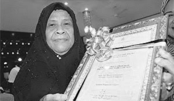 (Allahyarham Datuk Rogayah Sulong bersama dengan Trofi Johan Qariah Antarabangsa pada tahun 1978/FOTO Jheat Terengganu)