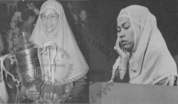 (Allahyarham Datuk Rogayah Sulong bersama dengan Trofi Johan Qariah Antarabangsa pada tahun 1978/FOTO Jheat Terengganu)
