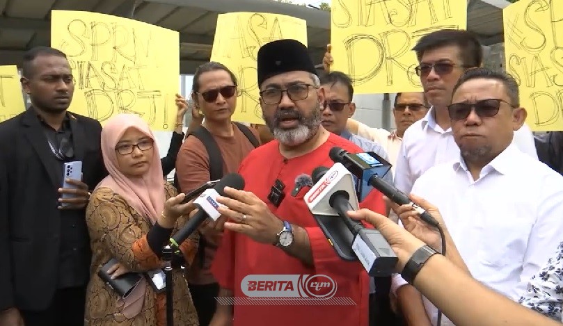 (Ghulam Muzaffar Ghulam Mustakim (merah) ditemui pemberita di hadapan