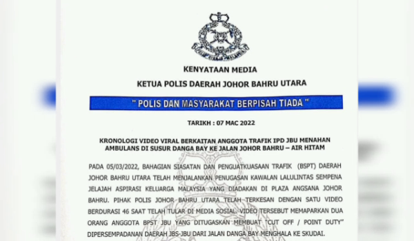 (Kenyataan media dikeluarkan PDRM berhubung insiden tahan ambulans di susur jalan Danga Bay-Johor Bahru)