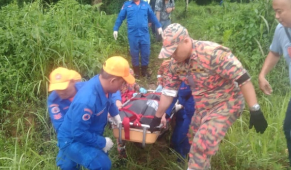 (Anggota pasukan penyelamat membawa mangsa keluar dari hutan lokasi mangsa ditemui/FOTO Bomba)