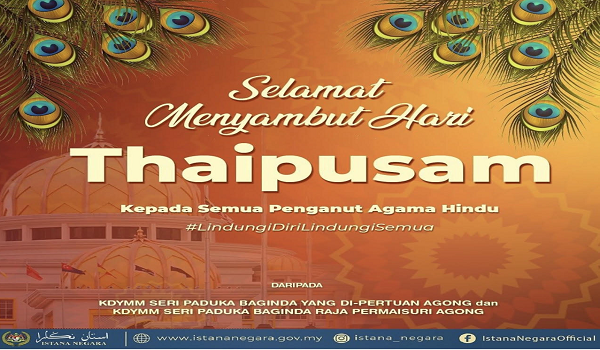 KUALA LUMPUR, 18 Januari – Yang di-Pertuan Agong Al-Sultan Abdullah Ri’ayatuddin Al-Mustafa Billah Shah menzahirkan ucapan selamat menyambut Hari Thaipusam kepada semua penganut agama Hindu, yang menyambut perayaan itu hari ini.