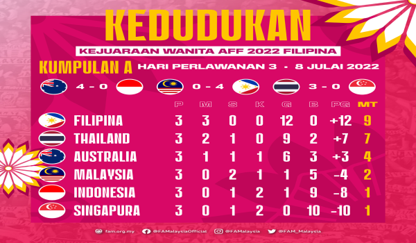 (Kedudukan terkini kumpulan A Kejohanan AFF Wanita 2022 selepas tiga perlawanan/ Foto FB FAM)