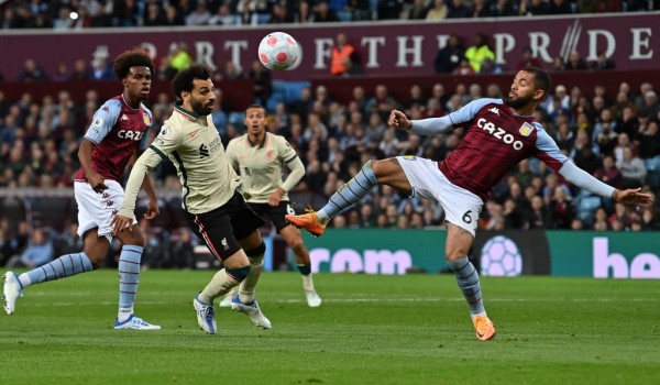(Pemain Liverpool, Mohamed Salah (kiri) bersaing dengan pemain Aston Villa, Douglas Luiz