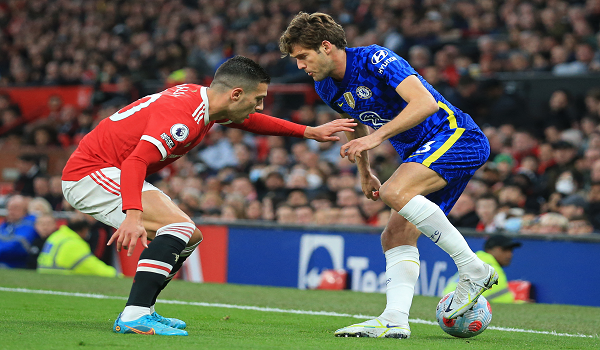 (Pertahanan Chelsea, Marcos Alonso dicabar Diogo Dalot pada aksi awal pagi tadi/AFP)