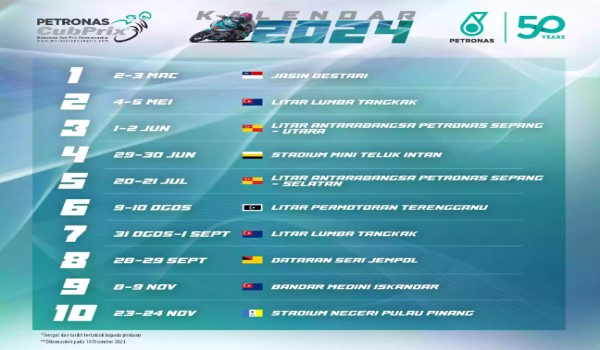 KUALA LUMPUR, 23 Disember– Kalendar Kejuaraan Cub Prix Malaysia musim 2024 menyaksikan 10 pusingan bakal berlangsung dengan saingan pembuka tirai dijadual bermula di Litar Jasin Bestari, Melaka Mac depan.