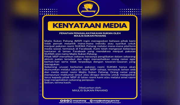 “Kami telah mengesan beberapa hantaran di laman Facebook yang mendakwa menjual pakaian SUKMA atas nama Majlis Sukan Pahang,” menurut kenyataan itu.
