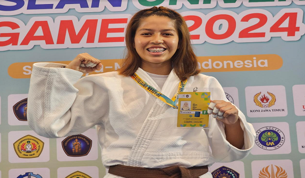 SURABAYA, 26 Jun – Atlet judo negara, Nur Farah Izzati Wallah meraih emas pertama Malaysia pada temasya Sukan Universiti Asean (AUG) 2024 Surabaya-Malang dalam saingan akhir kategori bawah 52 kilogram wanita di Pusat Konvensyen Airlangga, Surabaya, hari ini.