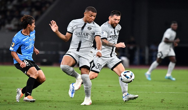 (Lionel Messi mengawal bola di sebelah penyerang Perancis Kylian Mbappe semasa perlawanan bola sepak Jelajah Jepun PSG menentang Kawasaki Frontale di Stadium Nasional di Tokyo/AFP)