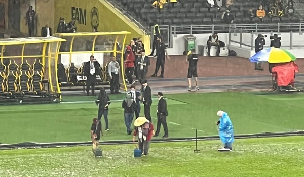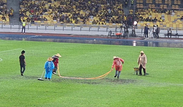 Semalam, tular beberapa petugas dilihat menggunakan penyodok dan kadbod dalam usaha mengatasi masalah air bertakung di Stadium Nasional selepas hujan lebat yang mengakibatkan hampir sepenuhnya permukaan padang digenangi air.