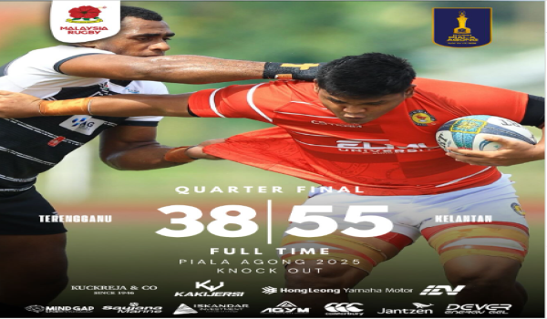 KUALA NERUS, 12 Oktober – Kelantan mara ke separuh akhir Kejohanan Ragbi Piala Agong edisi ke-41 selepas menewaskan Terengganu 55-38 dalam aksi suku akhir yang penuh sengit di Stadium Ragbi Tengku Muhammad Ismail, Kompleks Sukan Gong Badak, pada Sabtu.