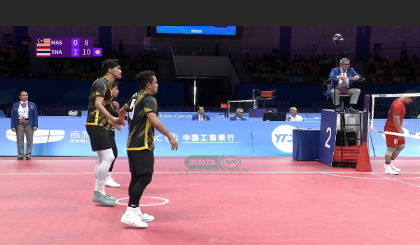 HANGZHOU, 7 Oktober – Skuad sepak takraw tewas 0-2 kepada Thailand dalam final acara regu lelaki, di Gimnasium Pusat Sukan Jinhua.
