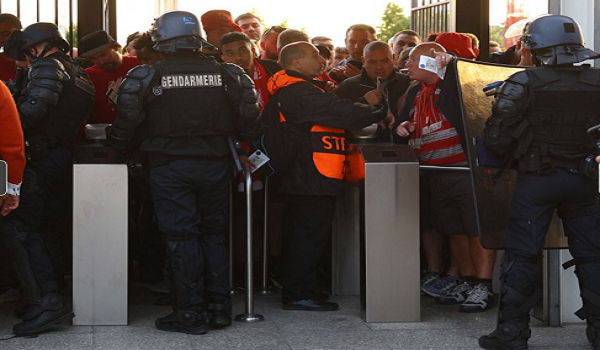 (Penyokong tersekat di pintu masuk sebelum aksi final Liga Juara-Juara Eropah antara Liverpool menentang Real Madrid di Stade de France, Paris/FOTO REUTERS)